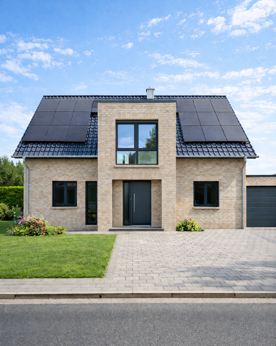 Eine 10,35 KW PV-Anlage mit einem 9,6 KW Batteriespeicher (vom Bauherrn in Eigenleistung erstellt) sorgt für mehr Unabhängigkeit und reduziert die Stromkosten auf Dauer.